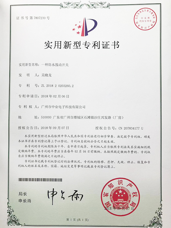 拨动开关专利认证